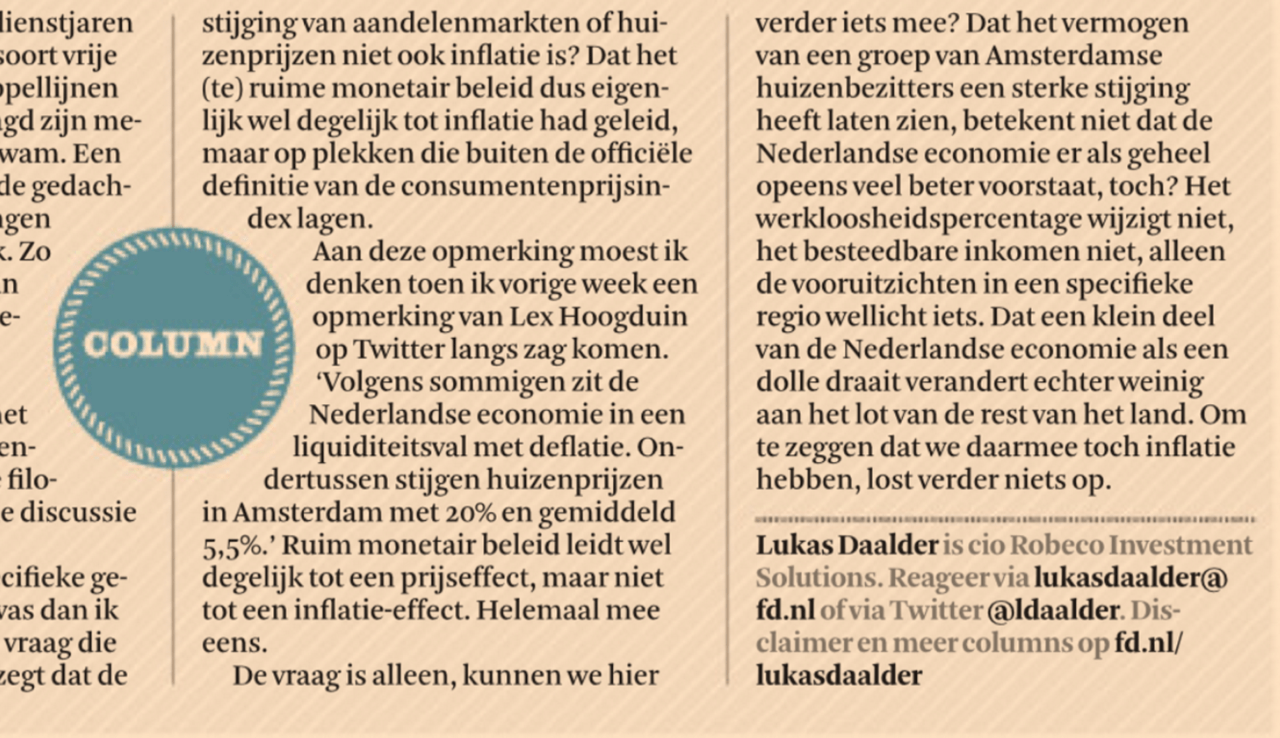 Aan deze opmerking moest ik denken toen ik vorige week een opmerking van Lex Hoogduin op Twitter langs zag komen. “Volgens sommigen zit de Nederlandse economie in een liquiditeitsval met deflatie. Ondertussen stijgen huizenprijzen in Amsterdam met 20% en gemiddeld 5,5%.” Ruim monetair beleid leidt wel degelijk tot een prijseffect, maar niet tot een inflatie-effect. Helemaal mee eens.