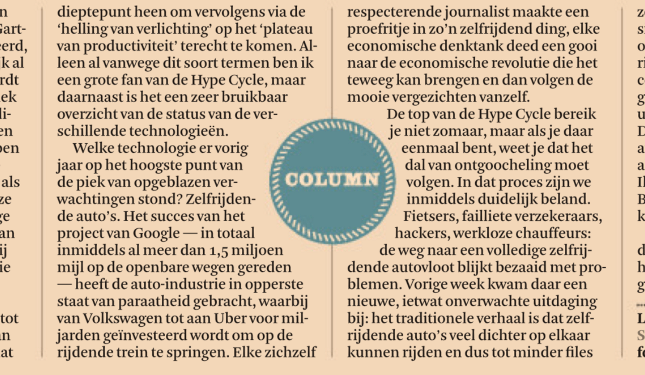 Welke technologie er vorig jaar op het hoogste punt van de piek van opgeblazen verwachtingen stond? Zelfrijdende auto’s. Het succes van het project van Google – in totaal inmiddels al meer dan 1,5 miljoen mijl op de openbare wegen gereden – heeft de auto-industrie in opperste staat van paraatheid gebracht, waarbij van Volkswagen tot aan Uber voor miljarden geïnvesteerd wordt om op de rijdende trein te springen. Elke zichzelf respecterende journalist maakte een proefritje in zo’n zelfrijdend ding, elke economische denktank deed een gooi naar de economische revolutie die het teweeg kan brengen en dan volgen de mooie vergezichten vanzelf.
