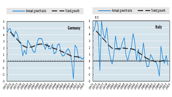 If you’re looking for proof that economic growth has not been so brisk in recent years, you don’t have to look far these days. Whether you’re looking at GDP growth or labor productivity, the picture is the same: lots of lines gradually trending towards zero. To give you an example, I’ve shown two graphs (from a series of seven) that clearly illustrate my point: labor productivity since the 70s for Germany and Italy, originating from a report published last week by the OECD. The picture is clear: though there are surprises to the upside year-on-year (blue line), the trend (black line) leaves little to the imagination. And this picture is repeated all over the place.
