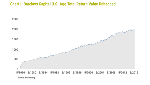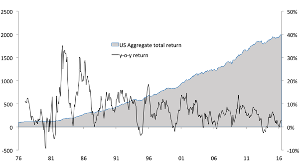 This graph is striking, to put it mildly. It shows the development of returns that a US investor would have earned if he had invested in the wider US bond market. Or more specifically, if he had invested in the broad index compiled since 1976 by Barclays that covers the entire universe of US government bonds, corporate bonds (with limited credit risk), and government agency bonds, but also includes more complicated investments, such as Asset Backed Securities. As an aside, the latter play a less important role in the whole.