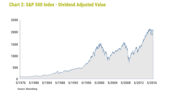 But I’m less impressed with what Gross then does by giving us the picture of the S&P500. Although he doesn’t waste any more words on this, the graph does give rise to the suggestion that you would have earned roughly the same with an investment in bonds as with the S&P500: both indices begin at 100 and end at around 2000. The term ‘dividend adjusted’ only contributes further to this suggestion: any other person would have called it the ‘price index’, but by adding the term dividend, it looks like there has been a correction for dividends. But that is actually not the case at all: this is the simple price index of the S&P500