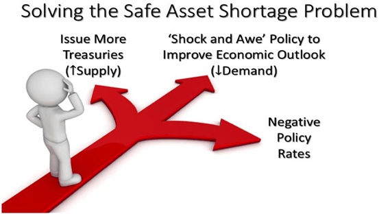 As an aside, the third arrow in this picture (negative policy rates by central banks) is a little confusing: I’m assuming that these should be positive rates. In that case, there is a credible and affordable alternative and demand for bonds would lessen.