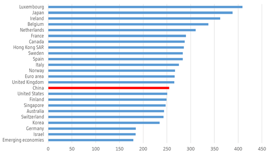 If you look at this overview, a country such as China doesn’t really stand out at all: it seems to be a sort of middle-of-the-road job, nestling between the US and the UK. However, if we look at the first graph, its exceptional position clearly does come to the fore. Certainly China doesn’t have especially high debt levels versus other developed countries, but if you add its level of development, you’ll see that China really does deviate from the norm. Or, if we just grab the title of this graph: China’s debt buildup is unusual for a low/middle-income country in peacetime.