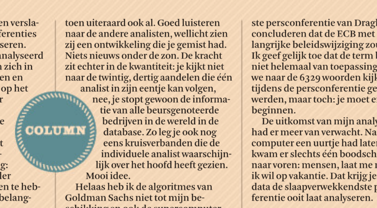 Eén van de podcast die ik op mijn dagelijkse reis naar- en van mijn werk afluister, is een podcast ‘Exchanges at Goldman Sachs’. Hierin delen medewerkers van Goldman Sachs hun visie over diverse onderwerpen, variërend van macro-economie tot financiële markten, van sectornieuws tot wetenschappelijke ontwikkelingen. Niet elke aflevering is even boeiend of relevant voor mij, maar de aflevering van een maand geleden (‘The big deal about big data’), vond ik toch wel weer erg boeiend. Hierbij werd het begrip Big Data aan de hand van voorbeelden uitgelegd, waarbij ook werd ingegaan op hoe ze er bij Goldman Sachs zelf mee opgingen. Het voorbeeld wat me daarbij opviel was dat ze tegenwoordig alle kwartaalverslagen, analistenrapporten en de verslagen van de telefonische conferenties die plaatsvinden door de computer laten analyseren. Hierbij wordt niet alleen geanalyseerd op gebruikte woorden – om zich in te dekken gebruiken analisten en CEO’s andere formuleringen op het moment dat ze voorzichtiger worden -, maar wordt bijvoorbeeld ook gefilterd op de vragen die analisten tijdens conference calls stellen. Niet zo zeer het antwoord is daarbij van belang, als wel de vraag: op die manier kan je -zonder zelf al te veel kennis van zaken te hebben- heel snel zien wat de belangrijkste issues zijn.