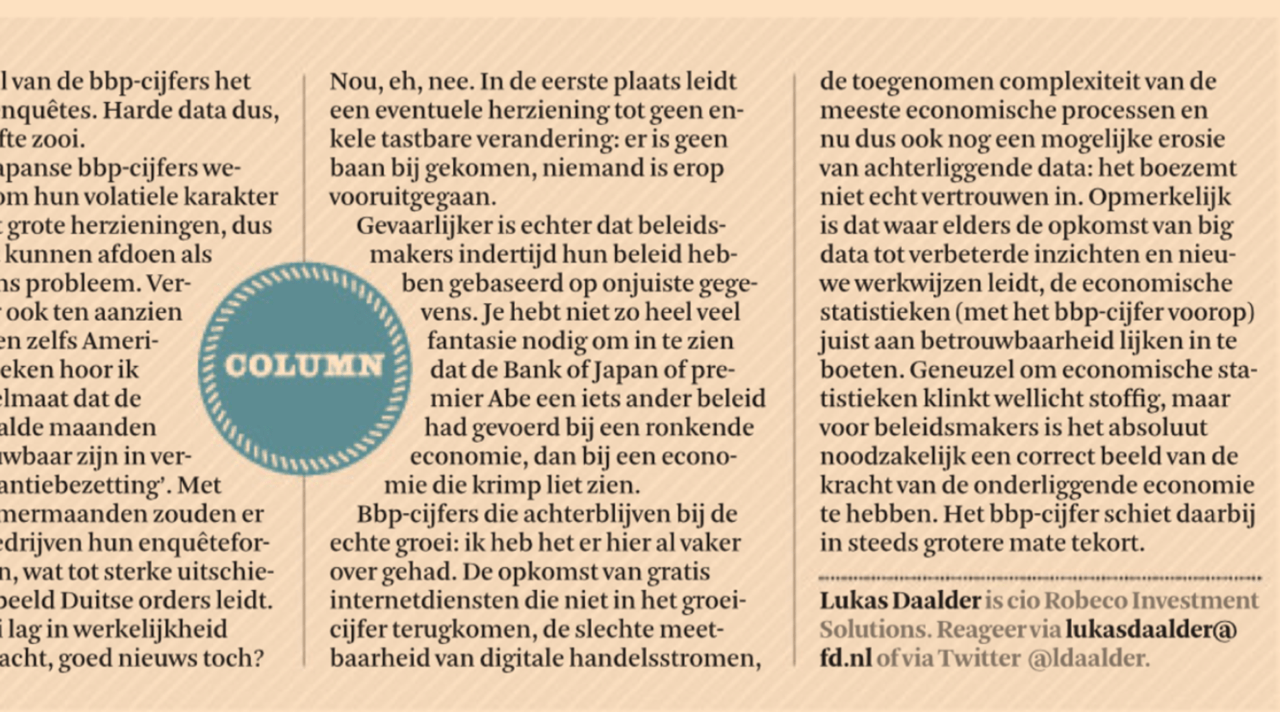 BBP-cijfers die achterblijven bij de echte groei: ik heb het er hier al vaker over gehad. De opkomst van gratis internetdiensten die niet in het groeicijfer terugkomen, de slechte meetbaarheid van digitale handelsstromen, de toegenomen complexiteit van de meeste economische processen en nu dus ook nog een mogelijke erosie van achterliggende data: het boezemt niet echt vertrouwen in. Opmerkelijk is dat waar elders de opkomst van Big Data tot verbeterde inzichten en nieuwe werkwijzen leidt, de economische statistieken (met het BBP-cijfer voorop) juist aan betrouwbaarheid lijken in te boeten. Geneuzel om economische statistieken klinkt wellicht stoffig, maar voor beleidsmakers is het absoluut noodzakelijk om een correct beeld van de kracht van de onderliggende economie te hebben. Het BBP-cijfer schiet daarbij in steeds grotere mate tekort.