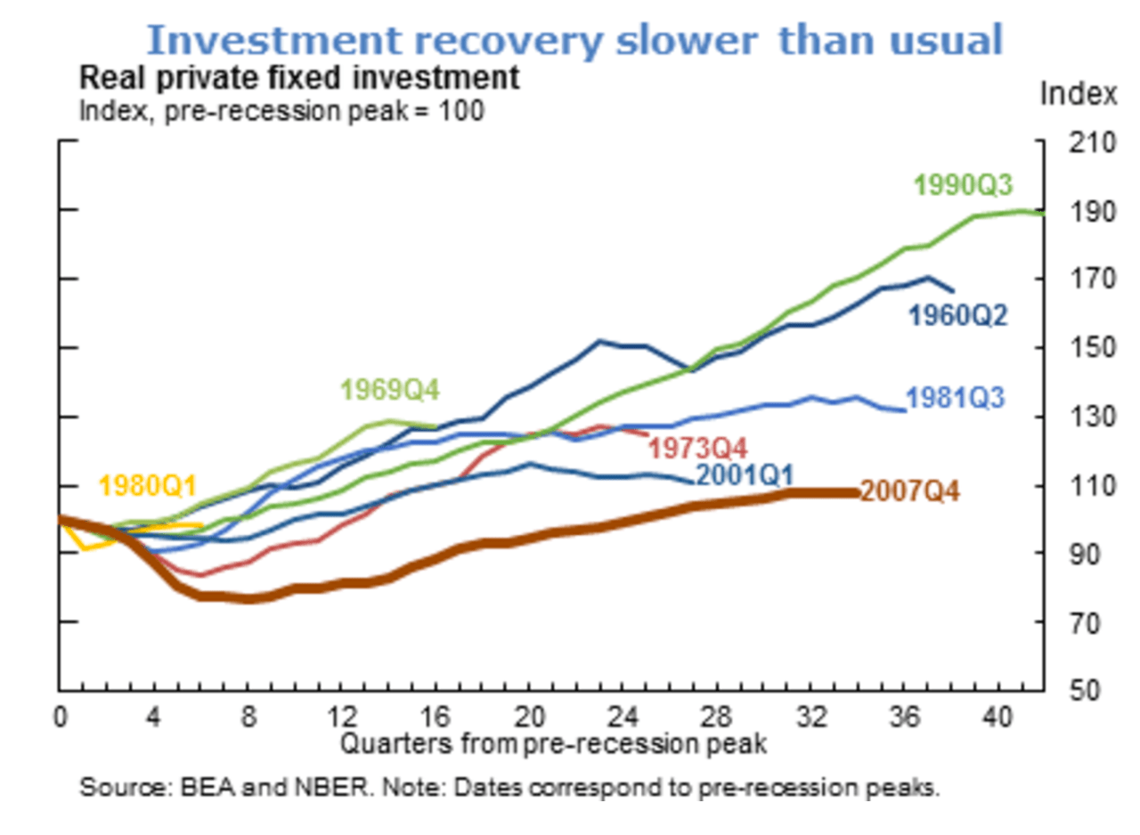 In the first Federal Reserve graph, the trend is broken down into various time intervals and uses the NBER definition of a US economic cycle. Essentially, the black lines in the second graph are the starting points as they show the peak of each expansion phase. That’s all well and good, but as this graph clearly shows, the dip occurring between 2007 and 2009 was the worst in that period. Of course, it’s not so surprising to see the biggest percentage drop occurring during the worst recession of the last 80 years. In other words, the thick red line in the first graph (2007 Q4) takes the sharpest dive, so recovering from such a huge blow will understandably take longer. While the graph’s title refers to investment recovery that is slower than usual, the graph mostly shows that the drop was sharper than normal. If you want to show the recovery, I think the trough is a more realistic starting point than the peak because you then really see the recovery phase.