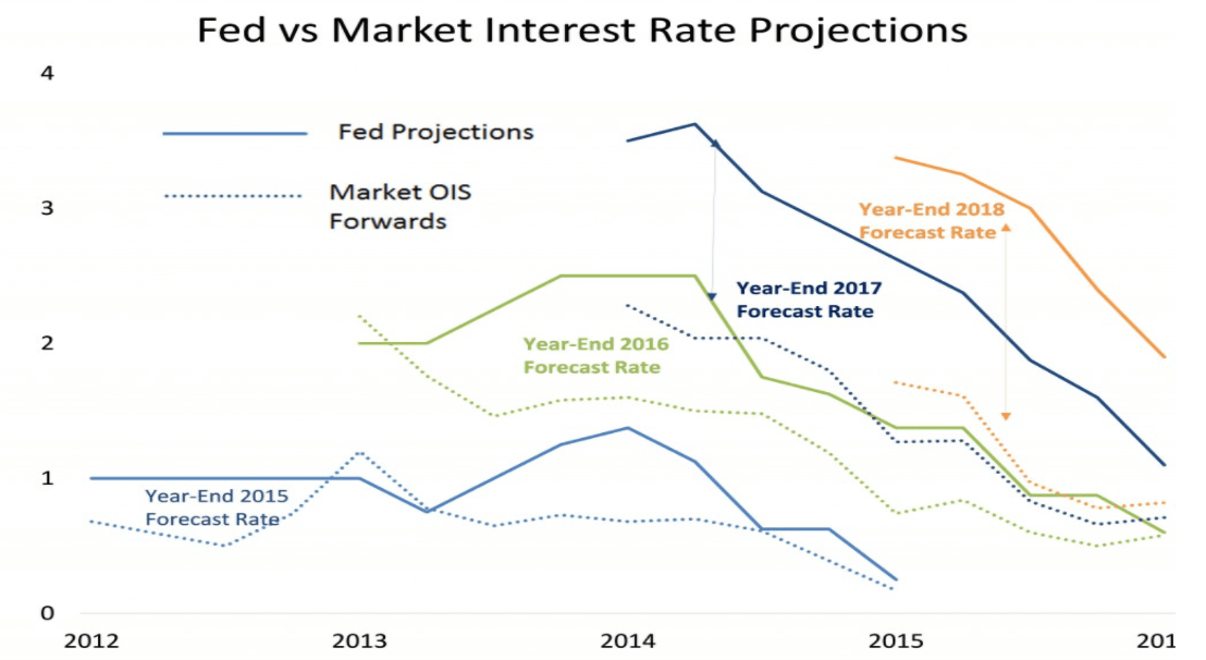 So what are we looking at? Basically we’re looking at how reliable the predictions are of the Federal Reserve (Fed), otherwise known as the US central bank. Since 2013, the Fed has been giving predictions for a number of variables, including expected growth, inflation and rate levels. The idea behind issuing these predictions was that it would provide financial markets with a better estimate of how the Fed viewed the US economy. The direct trigger for this was the strong rise in US capital market rates in 2013 that corresponded with the ‘taper tantrum’: fears that the Fed was going to stop buying up treasuries was enough to drive up US capital market rates by nearly 1.5%. By issuing expectations related to future policy for the coming years, the Fed managed to restore calm to the markets.