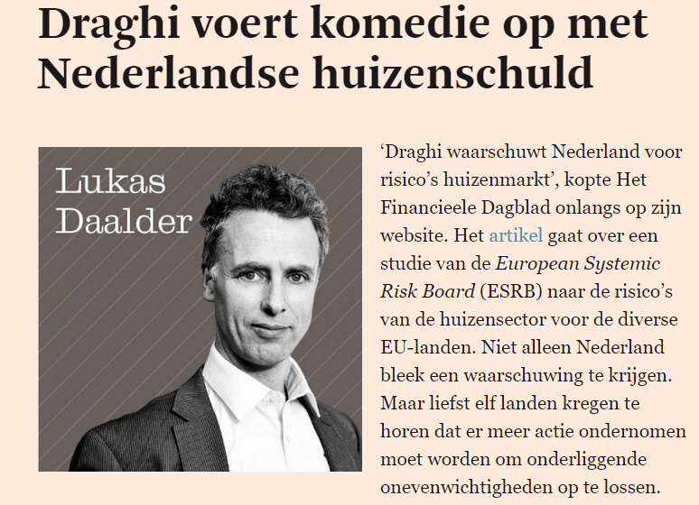 ‘Draghi waarschuwt Nederland voor risico’s huizenmarkt’, kopte het Financieele Dagblad vorige week op haar website. Het was een artikel naar aanleiding van een studie van de European Systemic Risk Board (ESRB) die de risico’s van de huizensector voor de diverse EU-landen in kaart bracht. Niet alleen Nederland bleek een waarschuwing te krijgen. Maar liefst elf landen kregen te horen dat er meer actie ondernomen moest worden om onderliggende onevenwichtigheden op te lossen.