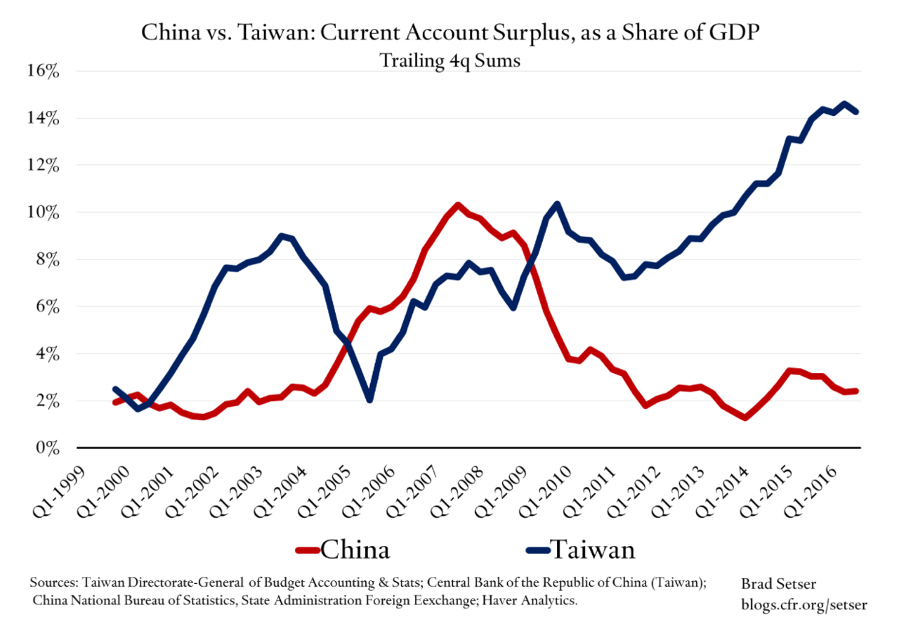 This brings us to the last, and most complex point: foreign currency purchases. I don’t have a nice graph for that one, but this criterion appears to only be met by one of the five countries: Taiwan. Though it’s not clear whether its purchases exceed 2% of GDP. As for Korea and China, in recent quarters, both have actually been selling foreign currency, which in fact supports their own currencies. Neither Germany (=ECB), nor Japan have intervened.