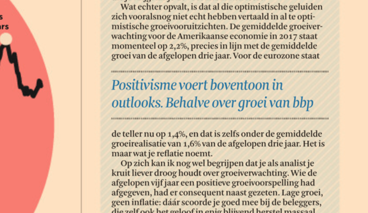 De algemene boodschap? Optimisme voert de boventoon. Reflatie is het toverwoord en met de verkiezing van Trump lijkt er eindelijk een keerpunt zijn bereikt. Althans, dat is de boodschap die je krijgt als je de vooruitblikken leest. Wat echter opvalt is dat al die optimistische geluiden zich vooralsnog niet echt hebben vertaald in al te optimistische groeivooruitzichten. De gemiddelde groeiverwachting voor de Amerikaanse economie in 2017 staat momenteel op 2,2%, precies in lijn met de gemiddelde groei van de afgelopen drie jaar. Voor de eurozone staat de teller nu op 1,4%, en dat is zelfs onder de gemiddelde groeirealisatie van 1,6% van de afgelopen drie jaar. Het is maar wat je reflatie noemt.