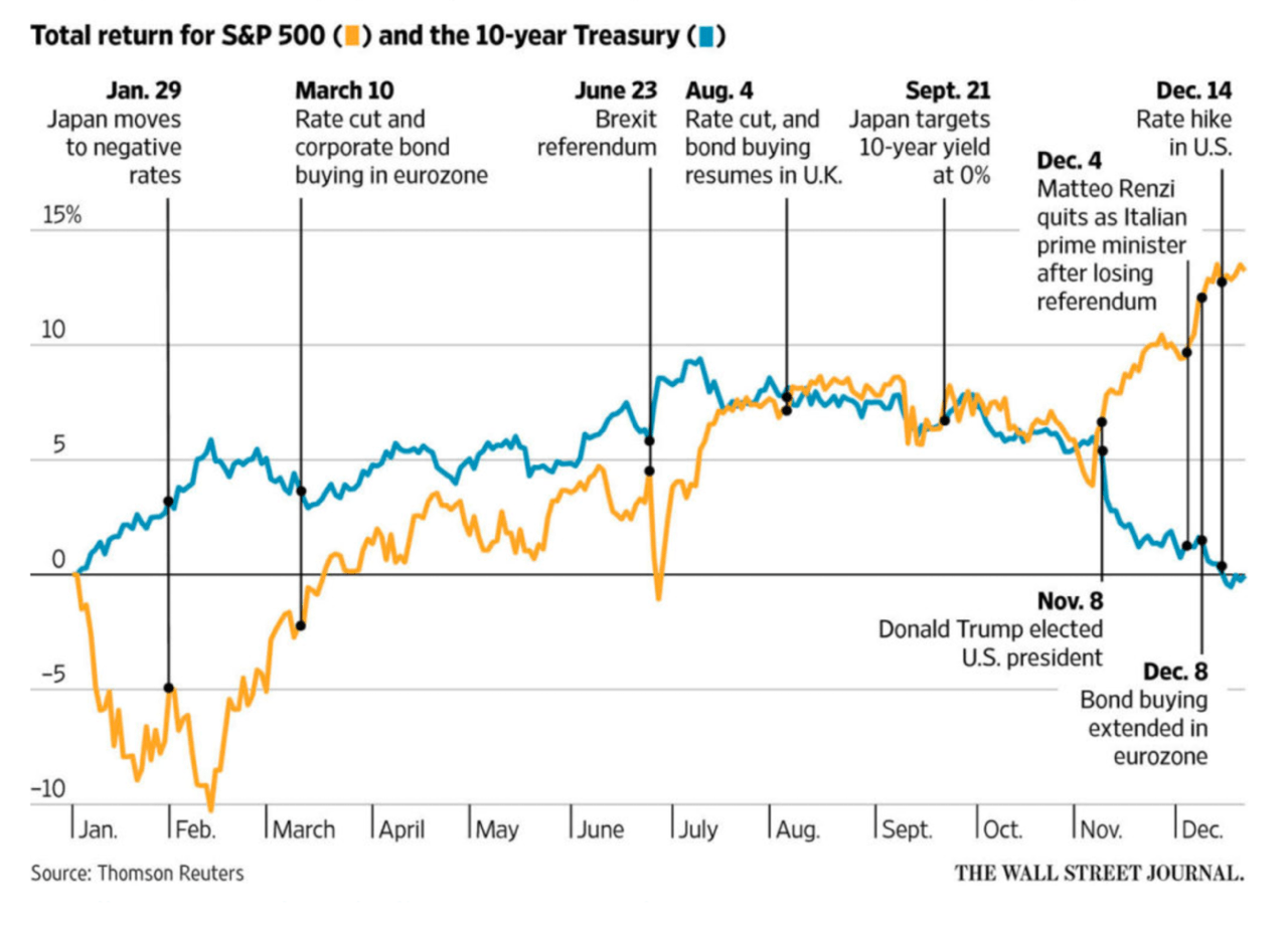 When the earth woke up on 9 November to the news that not Clinton, but Trump was to be the next US President, worldwide stock markets initially panicked. The Nikkei closed some 5% lower, Europe opened 3% in the red and even US futures took a sharp dive. However, the sell-off didn’t last for long, as once Trump had given his acceptance speech, sentiment turned and all losses were recovered in short order. Or at least losses on equity markets, as bond markets took a beating on that infamous day, with 10-year capital-market rates rising 0.2% points (20 basis points). The hope of one market (equities), turned out to be the fear of the other (bonds), something which we see clearly in this week’s graph. Right up to the day of the elections, investment returns in US equities and bonds were rising together, but in the six weeks that followed, we saw a gap appear of over 12%.