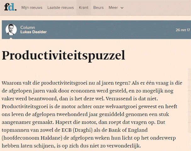 Waarom valt die productiviteitsgroei nu al jaren tegen? Als er één vraag is die de afgelopen jaren vaak door economen gesteld en zo mogelijk nog vaker beantwoord is, dan is het deze wel. Verrassend is dat niet. Productiviteitsgroei is de motor achter onze welvaartgroei geweest en heeft ons leven de afgelopen tweehonderd jaar gemiddeld genomen een stuk aangenamer gemaakt. Hapert die motor, dan roept dat vragen op. Dat topmannen van zowel de ECB (Draghi) als de Bank of England (hoofdeconoom Haldane) de afgelopen weken hun licht op het onderwerp hebben laten schijnen, is op zich dus niet zo verwonderlijk.