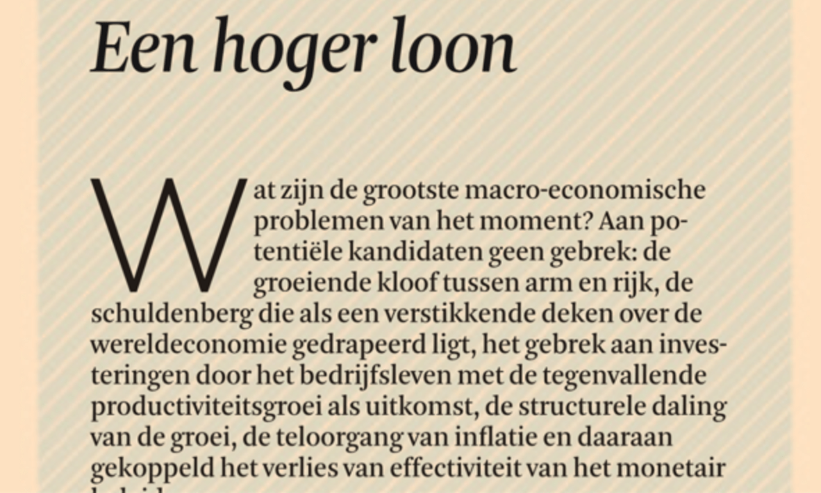 Het goede nieuws is dat er één simpele, elegante oplossing bestaat voor veel van de bovenstaande problemen: hogere loongroei. Een hoger loon is dé natuurlijke manier om te zorgen dat een groter deel van de koek naar arbeid en niet naar kapitaal gaat. Het maakt de armen rijker en dat creëert ruimte om schulden af te bouwen. Zet de miljarden aan liquide middelen die momenteel op de balansen van het bedrijfsleven prijken om naar lonen en moet je eens zien wat er met de consumptie en groei gebeurt! Met loonstijgingen doorbreek je bovendien de eindeloze trend van disinflatie, waarmee we eindelijk aan een normalisatie van het monetaire beleid kunnen gaan denken. Hogere lonen kunnen zelfs een prikkel zijn voor bedrijven om meer te gaan investeren en zo de lage productiviteitsgroei te keren. En ja, ik maak het wat mooier dan het in werkelijkheid zal zijn.