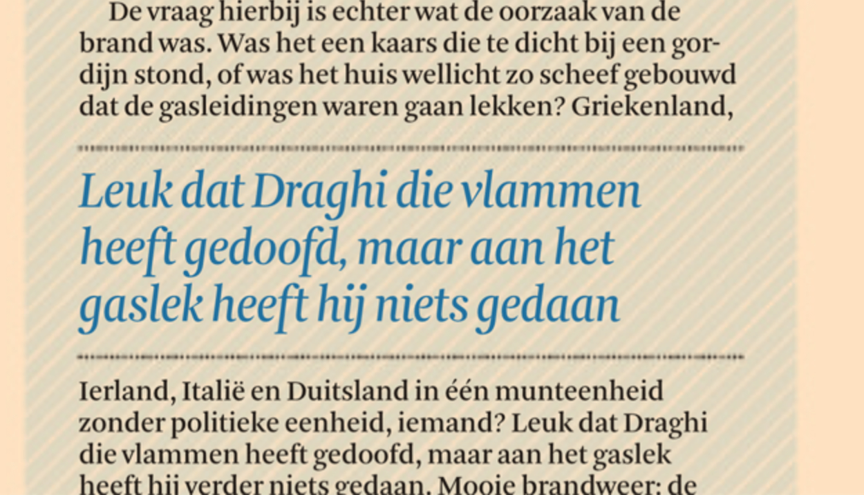 De vraag hierbij is echter wat de oorzaak van de brand was. Was het een kaars die te dicht bij een gordijn stond, of was het huis wellicht zo scheef gebouwd dat de gasleidingen waren gaan lekken? Griekenland, Ierland, Italië en Duitsland in één munteenheid zonder politieke eenheid, iemand? Leuk dat Draghi die vlammen heeft gedoofd, maar aan het gaslek heeft hij verder niets gedaan. Mooie brandweer: de symptomen zijn bestreden, de ziekte woekert lekker verder. En daar sta je dan met je natte broek en rode loper enthousiast te zwaaien naar de brandweer, terwijl de spanning in het huis achter je gestaag weer oploopt…