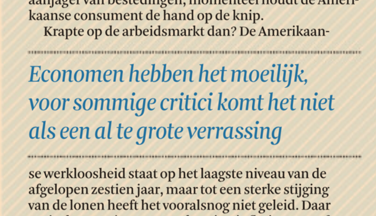 Economen, ze hebben het moeilijk. Dat ze geen al te goede track-record hebben wat betreft korte termijn voorspellingen, was al enig tijd bekend, maar inmiddels lijken de problemen toch wat structureler van aard te zijn. Voorbeelden te over. Kunt u zich het gekrakeel nog herinneren toen de centrale banken van deze wereld hun balansen opbliezen en de markt met liquiditeit overspoelden? Hyperinflatie zou ons ten deel vallen. Ruim acht jaar later en van desastreuze geldontwaarding is nog steeds geen sprake. Toen in 2015 en 2016 de olieprijs halveerde zou dat de opmaat zijn voor een sterk en consumptie gedreven groeiherstel. Een stijging van het besteedbaar inkomen, een waardeoverdracht van de oliestaten naar de Amerikaanse consument, de motor achter de wereldeconomie: klinkt logisch, toch? Het zal vast een rol hebben gespeeld, maar van een krachtig groeiherstel lijkt in de VS nog steeds geen sprake. Nog zo eentje: Amerikaanse aandelenmarkten en huizenprijzen zijn de afgelopen vijf jaar sterk opgelopen, waarmee het netto vermogen inmiddels tot 40% boven de piek van 2007 ligt. Was dit vermogen vroeger de aanjager van bestedingen, momenteel houdt de Amerikaanse consument de hand op de knip. Krapte op de arbeidsmarkt dan? De Amerikaanse werkloosheid staat op het laagste niveau van de afgelopen 16 jaar, maar tot een sterke stijging van de lonen heeft het vooralsnog niet geleid. Daar sta je dan met je NAIRU (non-accelerating inflation rate of unemployment)en je Philips-curve (verondersteld verband tussen inflatie en werkloosheid).