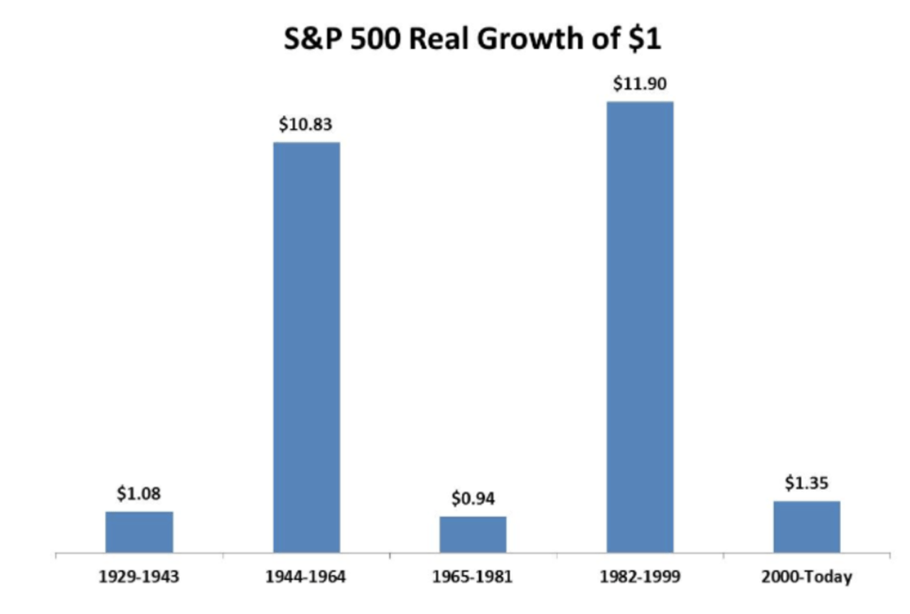 The first bar shows that if you had invested USD 1 on the S&P 500 in 1929, by the end of 1943, that dollar would have been worth USD 1.08. So the real return for the entire period was only 8%, which means the average annual return was just a measly 0.55%. But there were better times ahead: during the 20 years represented by the second bar, the return was almost 1000%. In these 20 years that included the end of World War II and the period immediately after, your annual real return would have been 12.7%. But the lean times returned: in the next 16 years, your return would actually have been negative. The message is: the stock market is turbulent.