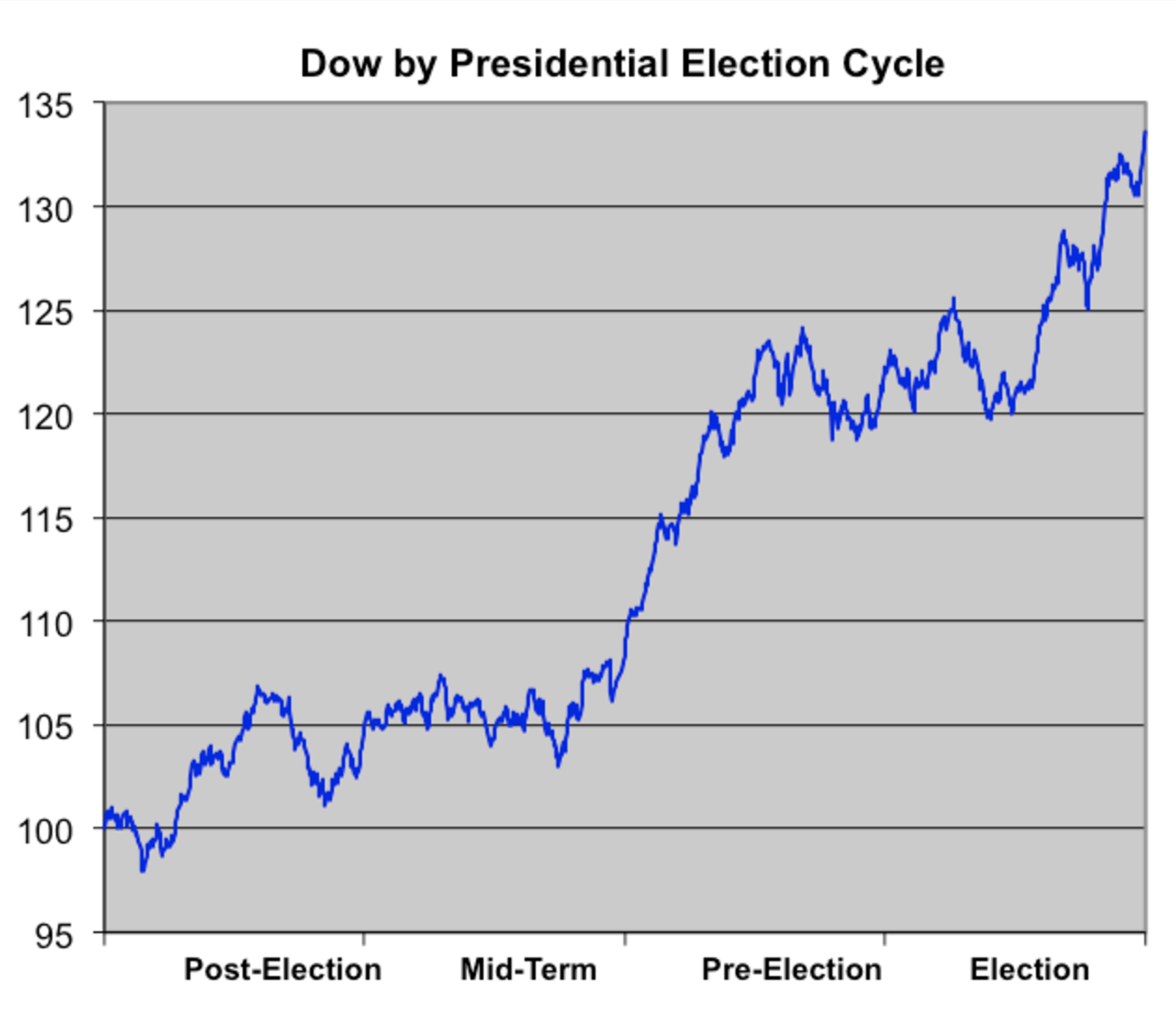 So what does this graph tell us? The line shows the historic development of the Dow Jones over the four years of a US presidency. Specifically, it relates to the average course of the 30 presidential cycles that have occurred over the last 120 years. So we’re not talking about the last 30 presidents: otherwise we’d have to go all the way back to Franklin Pierce, who bore the scepter in the period 1853-57. The graph ignores re-elections, impeachments or deaths: every four years, the clock resets and gives us an average, resulting in the graph above.