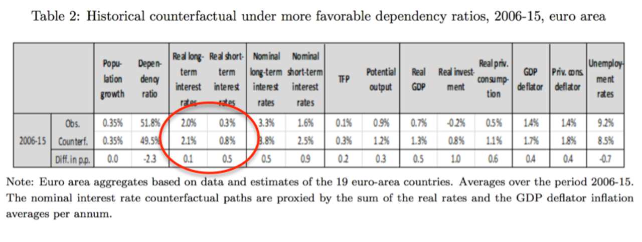 To defend the researchers: there has been an impact on real short rates: from the factual 0.3% to the counterfactual (that we cannot know) of 0.8%. This sounds substantial enough to warrant the “downward pressures on real short- and long-term interest rates” bit, but this does raise the question what has been the cause behind this drop: ageing people or policy choices by the council of the ECB? On the one hand one can claim that the ECB reacts to what happens in the world, but on the other there is a fair amount of discretion of the policy chosen. As an example, the Federal Reserve never lowered interest rate below 0%, whereas the ECB pushed its deposit rate to -0.4%.