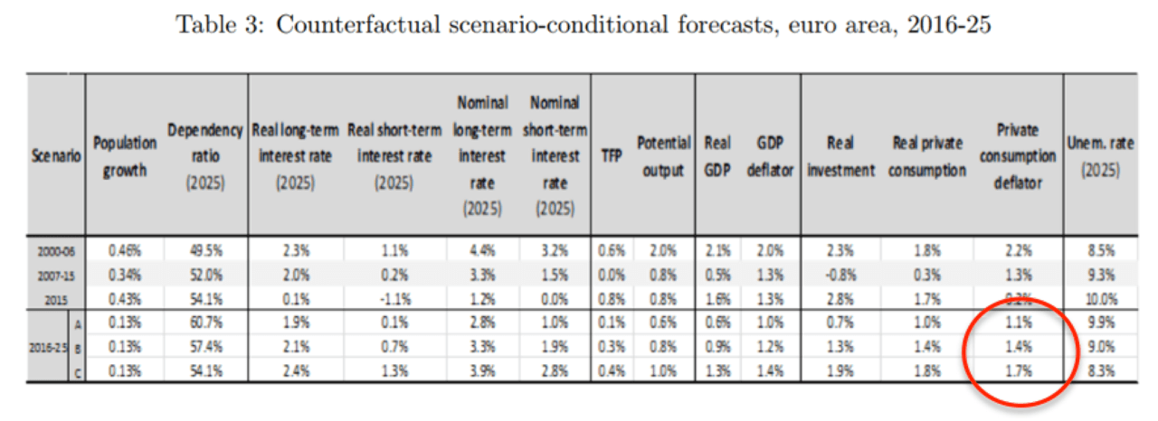Three scenarios are being presented for the future, all with different dependency ratios. The interesting part of this table is the projection of the private consumer deflator: even in the best outcome scenario (dependency rates remaining stable from the 2015 level) inflation will on average reach 1.7%: in the two more realistic scenarios inflation will average 1.4% and 1.1% respectively. In other words, according to this piece of research, the ECB will not be able to reach its inflation target the next ten years. Counterfactually so!