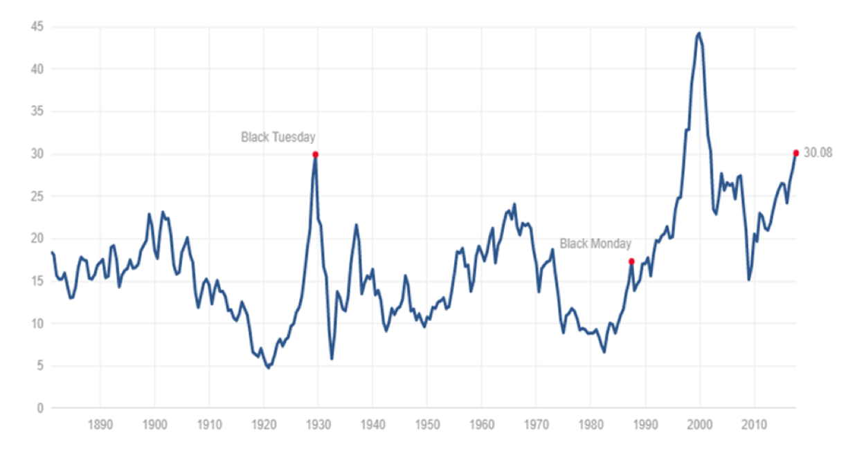 The measure most commonly used to show that stocks are overvalued is Robert Shiller’s price/earnings ratio, also known as the Cyclical Adjust Price Earnings (CAPE) measure, or simply ‘Shiller PE’. Unlike the usual price/earnings ratios, the Shiller PE doesn’t look at expected profits or the last year’s profits, but the average over the last ten years in real terms. The reason why Shiller uses such a long timescale is to smooth out the volatile nature of earnings and create a more stable picture. The graph above, which shows changes in the Shiller PE over time, leaves little to the imagination. There are clear outliers indicating the major stock market bubbles of 1929 and 2000, and the damage they left in their wake. In fact, the level of the Shiller PE is now suspiciously close to where it was during the 1929 crash, which back then marked the start of the Great Depression. According to this measure, the only time prices were higher was during the 2000 Internet bubble… which is indeed worrying.