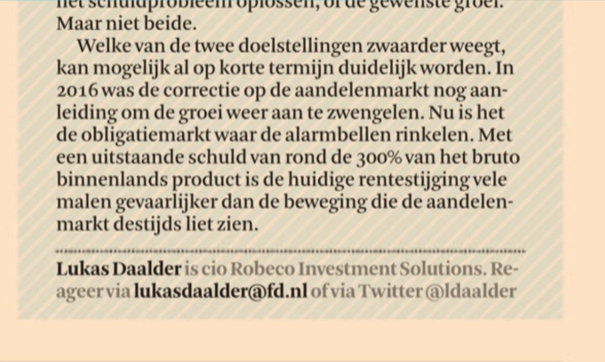 Welke van de twee doelstellingen zwaarder weegt kan mogelijk al op korte termijn duidelijk worden. In 2016 was de correctie op de aandelenmarkt nog aanleiding om de groei weer aan te zwengelen. Nu is het de obligatiemarkt waar de alarmbellen rinkelen. Met een uitstaande schuld van rond de 300% van het BBP is de huidige rentestijging vele malen gevaarlijker dan de beweging die de aandelenmarkt destijds liet zien.