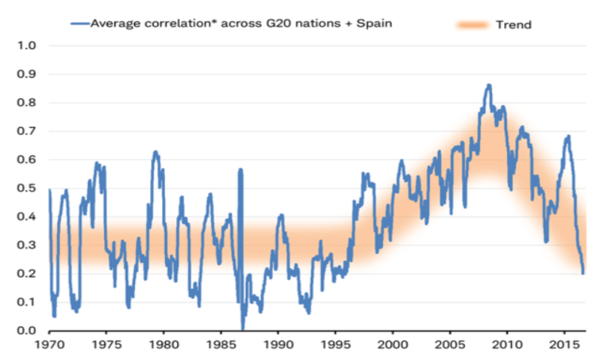This part may be a bit geekier, but I will put it in nevertheless to explain the complexity of the chart. To create it, you first look at the correlation of two markets, say the US and Germany. You calculate the one-month change in both markets (based on daily data) and then compute the correlation of that series over a period of a year (hold on, we’re nearly there). This gives you a line that shows the continual course of the correlation between the US and German markets from 1970. You then repeat that process for the US and French markets, the US and Chinese markets, the US and Russian markets, et cetera. With 21 countries, that gives us 20 correlation series with the US market, but then you’ve got the German-French, German-Chinese, German-Russian, et cetera, followed by the UK-Chinese, UK-Russian and then all the rest. With 21 countries, this gives us 200 correlation series. If you then take the average of these, you arrive at the line above.