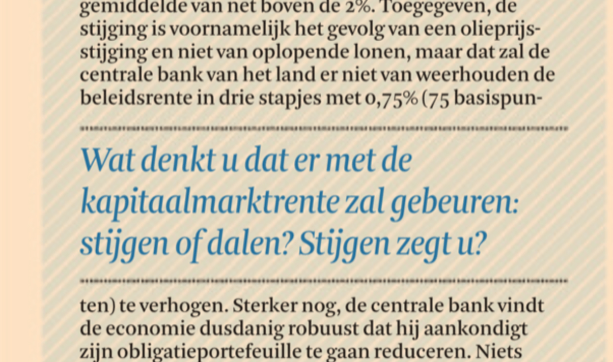 Goed, kom ik bij de voorspelling. Wat denkt u dat dat er in dit geval met de kapitaalmarktrente zal gebeuren: stijgen of dalen? Stijgen zegt u? Tssss….