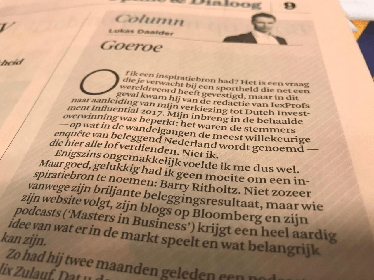 Of ik een inspiratiebron had? Het is een vraag die je verwacht bij een sportheld die net een wereldrecord heeft neergezet, maar in dit geval kwam hij van de redactie van IexProfs naar aanleiding van mijn verkiezing tot de Dutch Investment Influential van het jaar 2017. Mijn inbreng in de behaalde overwinning was beperkt: het waren de stemmers – op wat in de wandelgangen de meest willekeurige enquête van beleggend Nederland wordt genoemd – die hier alle lof verdienden, niet ik. Enigszins ongemakkelijk voelde ik me dus wel in deze rol. Maar goed, gelukkig had ik geen moeite om een inspiratiebron te noemen: Barry Ritholtz. Niet zo zeer vanwege zijn briljante beleggingsresultaat, maar wie zijn website volgt, zijn blogs op Bloomberg en zijn podcasts (Masters in Business) krijgt een heel aardig idee van wat er in de markt speelt en wat belangrijk kan zijn.