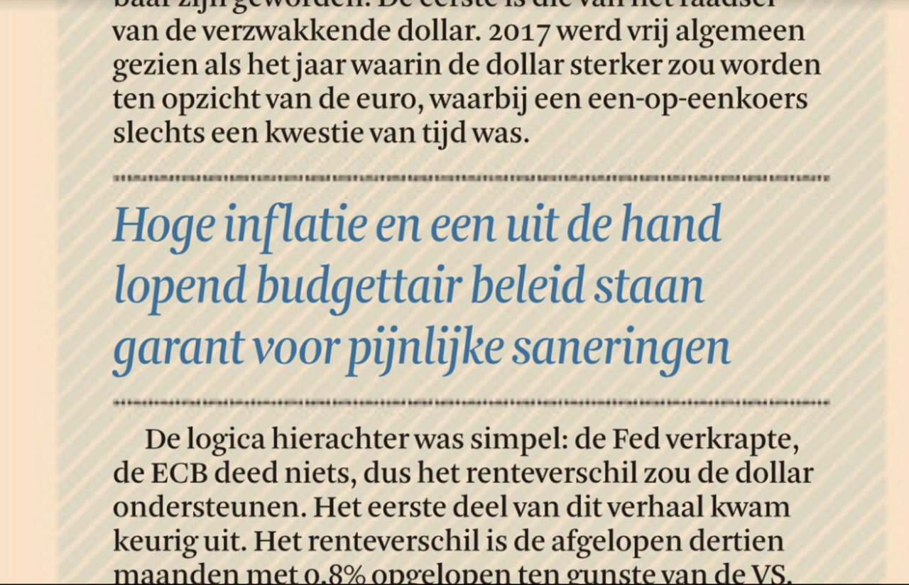 Een munt die verzwakt in weerwil van hogere rentes en een obligatiemarkt die in het geval van onrust niet als een veilige haven fungeert. Het is het beeld dat goed past bij de ontwikkeling van de financiële markten van een opkomend land met hoge inflatie en een uit de hand lopend budgettair beleid. De ervaring leert dat een dergelijk land doorgaans door een pijnlijk saneringsproces heen zal moeten gaan voordat het vertrouwen weer enigszins terugkeert. Of dat ook zo is als we het over de grootste economie van de wereld hebben, moeten we nog even afwachten.