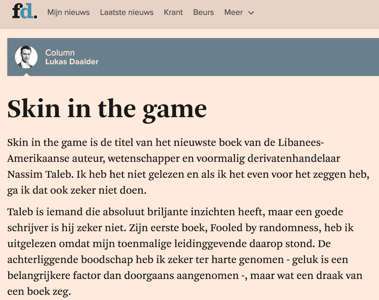Dit is dus zeker geen recensie van zijn boek. Wat dit wel is, is een waarschuwing tegen de term skin in the game. Wat is skin in the game? Een CEO of fondsbeheerder die skin in the game heeft, is iemand die een deel van zijn vermogen geïnvesteerd heeft in het bedrijf of fonds waar hij verantwoordelijk is. Zo profiteert hij bij succes, maar voelt ook net zo hard de pijn als zijn beleid faalt. Ik geloof zo dat het werkt.