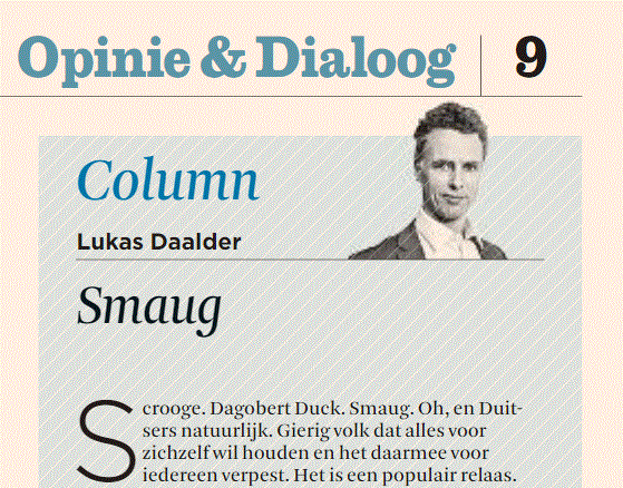 Wat blijkt? Er is sprake van een asymmetrische aanpassing. Schuldlanden schroeven hun bestedingen inderdaad terug, maar bij vermogende landen blijft een vergelijkbare stimulans uit. Het mogelijke gevolg, en hier quote ik de studie, ‘would likely imply a slowdown in both global trade and GDP growth’. Het beeld van Smaug, de draak in The Hobbit die waakt over zijn gouden schat, dringt zich op. Draak, Dagobert Duck, Duitsland – deze hamsterwoede is destructief en heeft er nu zelfs toe geleid dat we in een handelsoorlog verzeild zijn geraakt. Merkel moet de eigen economie stimuleren om zo de Eurozone en ook de wereldeconomie te ondersteunen.