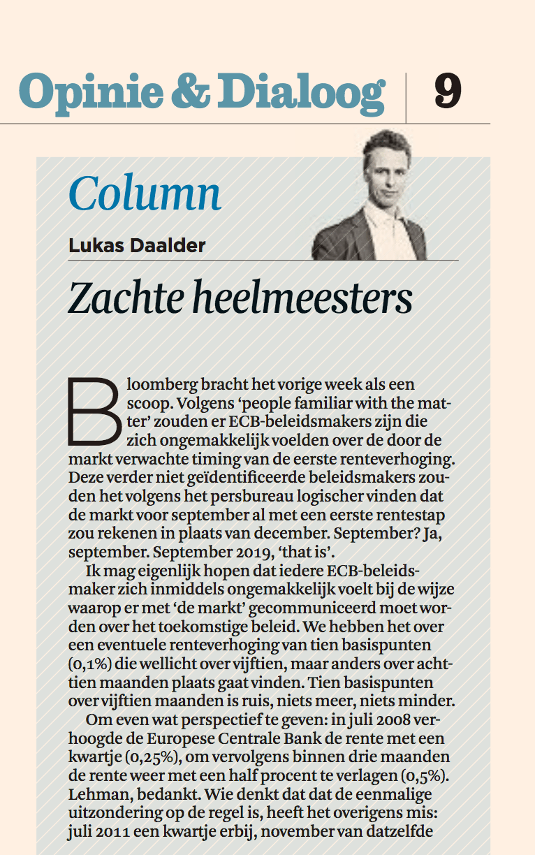 Bloomberg bracht het vorige week als een scoop. Volgens ‘people familiar with the matter’ zouden er ECB-beleidsmakers zijn die zich ongemakkelijk voelden over de door de markt verwachte timing van de eerste renteverhoging. Deze verder niet geïdentificeerde beleidsmakers zouden het volgens het persbureau logischer vinden dat de markt voor september al met een eerste rentestap zouden rekenen in plaats van december. September? Ja, september. September 2019, that is.