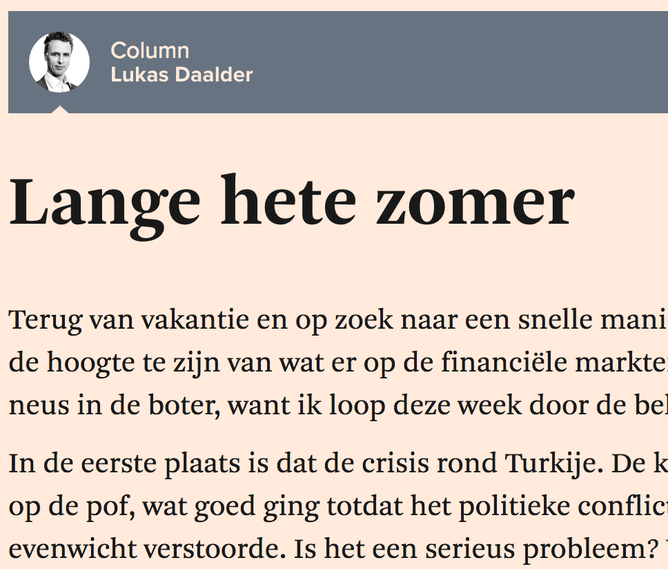 In de eerste plaats is dat de crisis rond Turkije. De korte versie: Turkije leefde op de pof, wat goed ging totdat het politieke conflict met de VS het fragiele evenwicht verstoorde. Is het een serieus probleem? Voor Turkije zeker, maar eerlijk gezegd vermoed ik dat dit voor de financiële markten een zogenaamde tweeweeks vlieg zal blijken te zijn. De mogelijke financiële spillover-effecten van de Turkse crisis zijn beperkt en bovendien al redelijk verdisconteerd. Turkije heeft een probleem, de rest van de wereld nauwelijks.