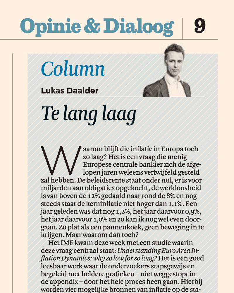 Waarom blijft die inflatie in Europa toch zo laag? Het is een vraag die menig Europese centrale bankier zich de afgelopen jaren weleens vertwijfeld gesteld zal hebben. De beleidsrente staat onder nul, er is voor miljarden aan obligaties opgekocht, de werkloosheid is van boven de 12% gedaald naar rond de 8% en nog steeds staat de kerninflatie niet hoger dan 1,1%. Een jaar geleden was dat nog 1,2%, het jaar daarvoor 0,9%, het jaar daarvoor 1,0% en zo kan ik nog wel even doorgaan. Zo plat als een pannenkoek, geen beweging in te krijgen. Maar waarom dan toch?