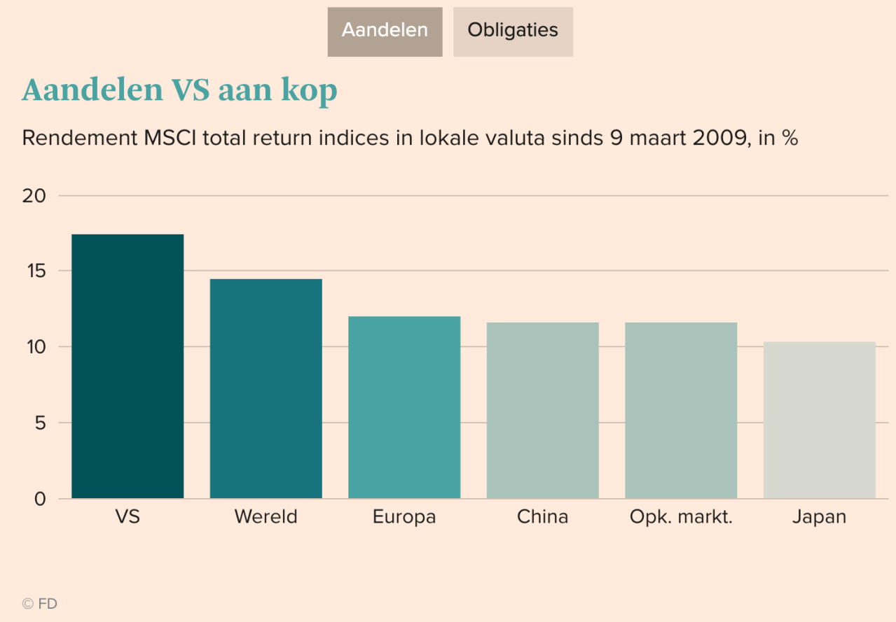 Kijk ik wederom naar de data van de MSCI, dan staat de winst per aandeel voor de Amerikaanse markt momenteel 67% boven het hoogste niveau dat we vlak voor de crisis van 2008 bereikten, waar de rest van de wereld tegen een winstdaling van ongeveer 25% aankijkt. Al met al niet zo heel erg vreemd dat het rendement in de Amerikaanse aandelenmarkt zoveel hoger lag dan elders.