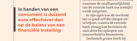 Overigens doe ik Rogoff tekort met deze weergave, want hij ging wel degelijk serieus op het onderwerp in. Zijn grootste bezwaar: door het inzetten van helikoptergeld verwatert de scheidslijn tussen centrale bank en overheid, waarmee de onafhankelijkheid van de centrale bank (op termijn) wordt aangetast. In zijn ogen kan de overheid net zo goed zelf die cheque uitschrijven, waarna de centrale bank alsnog kan besluiten de zaak door het opkopen van staatsschuld te financieren.