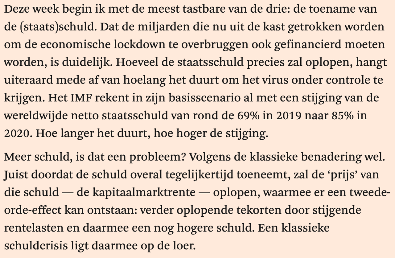 Deze week begin ik met de meest tastbare van de drie: de toename van de (staats)schuld. Dat de miljarden die nu uit de kast getrokken worden om de economische lockdown te overbruggen ook gefinancierd moeten worden, is duidelijk. Hoeveel de staatsschuld precies zal oplopen, hangt uiteraard mede af van hoelang het duurt om het virus onder controle te krijgen. Het IMF rekent in zijn basisscenario al met een stijging van de wereldwijde netto staatsschuld van rond de 69% in 2019 naar 85% in 2020. Hoe langer het duurt, hoe hoger de stijging.