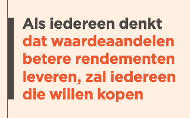 Dus wat ik van waarde-aandelen vind? Ik vind het een perfect schoolvoorbeeld dat gratis geld in financiële markten niet bestaat. Hiermee bedoel ik niet dat het onderzoek van Fama en French niet zou kloppen, absoluut niet. Wat ik hiermee wil zeggen is dat een populaire beleggingsstrategie op een goed moment aan zijn eigen succes ten onder zal gaan. Als iedereen overtuigd is dat waarde-aandelen betere rendementen opleveren, zal iedereen juist die aandelen willen kopen.