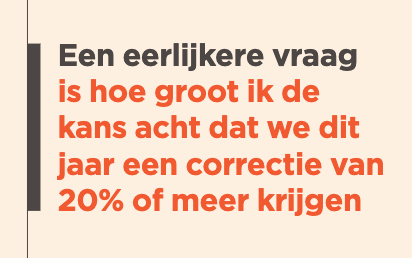 Sowieso, ging ik door, gaf de manier waarop de vraag nu gesteld werd me maar twee antwoordmogelijkheden: ja of nee. Koos ik ja, dan zou geconcludeerd worden dat ik een bearmarkt voor 2022 voorspelde. Zei ik nee, dan zou ik een rozebrillenstrateeg zijn die geen enkel vuiltje aan de lucht zag. Een eerlijkere vraag zou zijn hoe groot ik de kans achtte dat we in 2022 een correctie van 20% of meer zouden krijgen, zo hield ik mijn toehoorder voor.