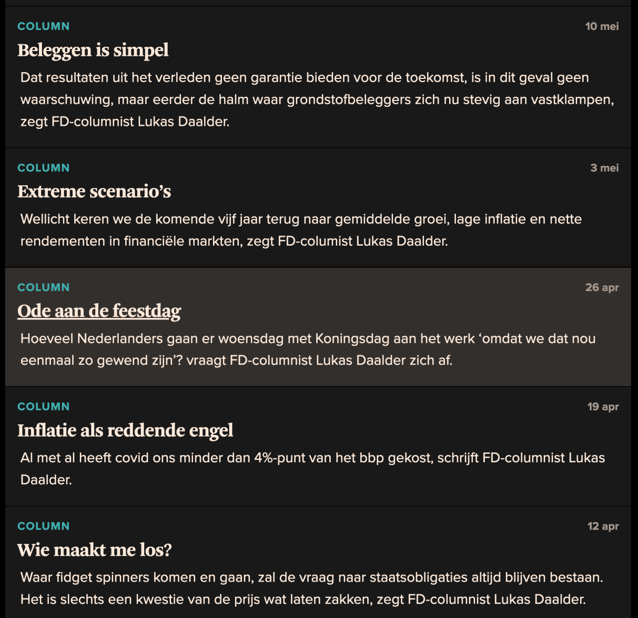 Het is pas mei, maar ik zie hier en daar al berichten waarin 2022 wordt afgeschreven als het slechtste beleggingsjaar on record. Zo las ik dinsdag in het FD dat de AEX na een nieuwe koersdaling stevig in bearmarkt is beland, viel mijn oog vorige week op een artikel in The Wall Street Journal dat kopte It’s the Worst Bond Market Since 1842, en dat je ook niemand meer over crypto’s hoort, zegt denk ik wel genoeg.