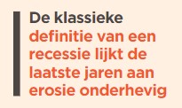 Dat punt lijken we inmiddels ook een beetje bereikt te hebben als het gaat om de term recessie. Zeker, we hebben de klassieke definitie van een recessie — die van twee achtereenvolgende kwartalen van negatieve bbp-groei —, maar die lijkt de afgelopen jaren onderhevig aan erosie.